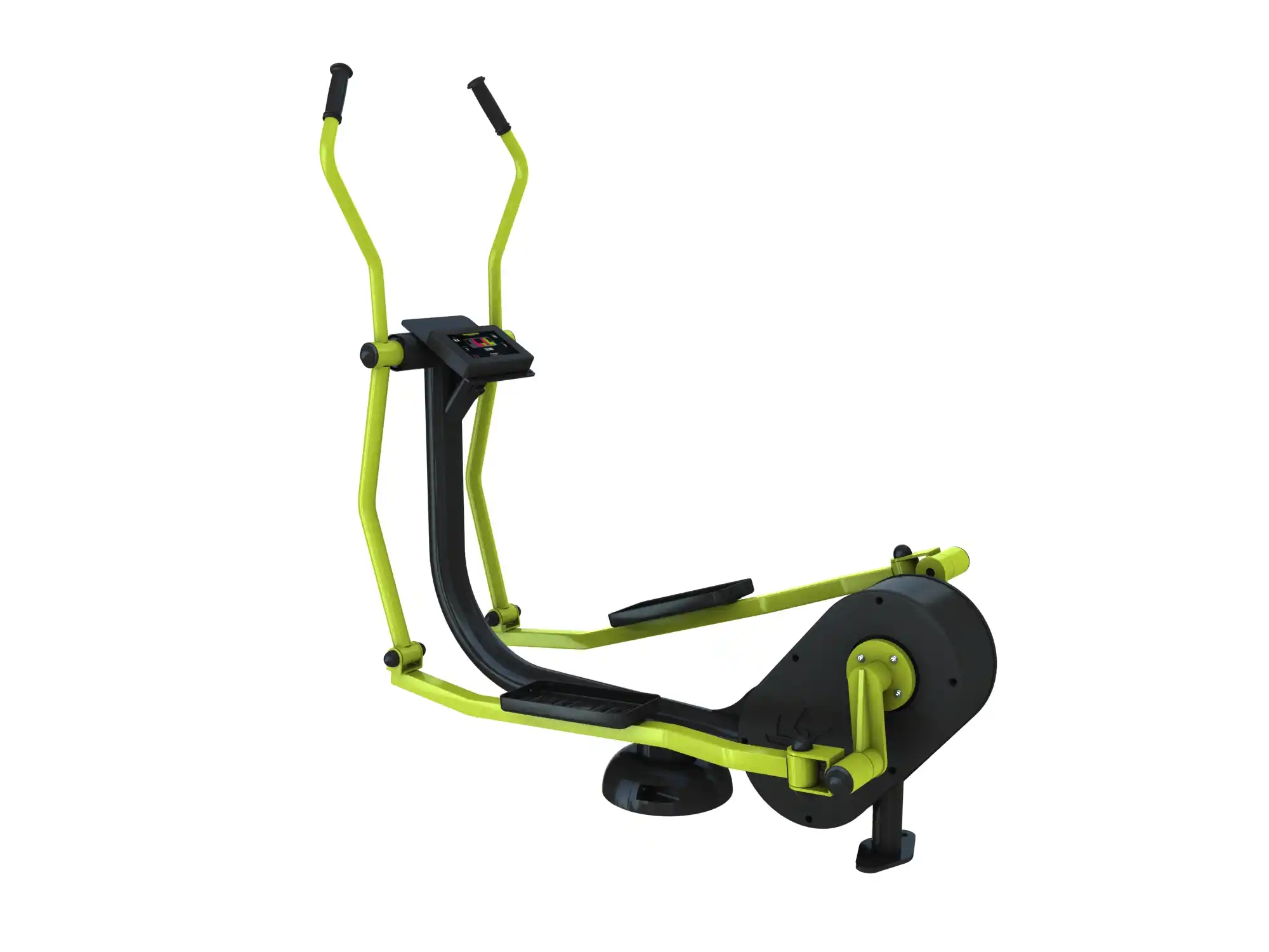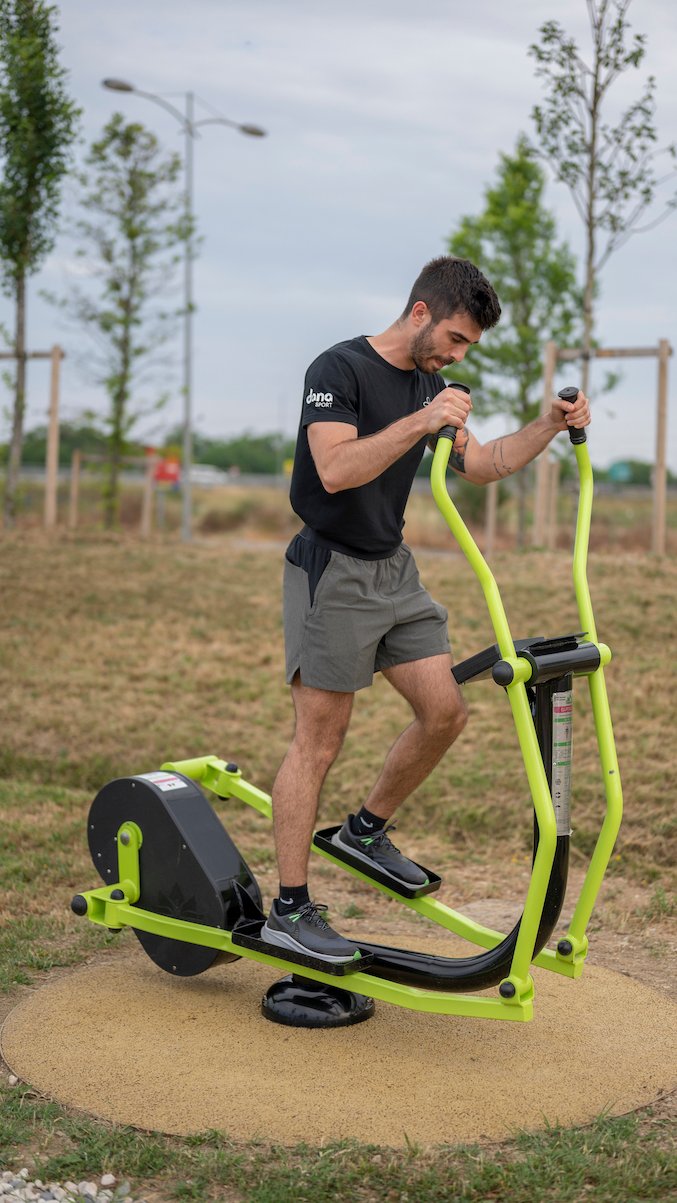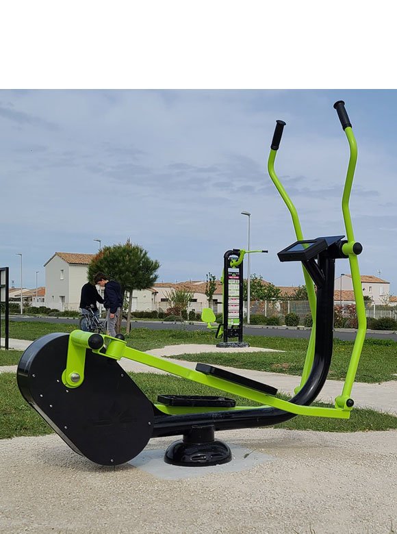 Le vélo elliptique R-Pro Freetness est un appareil de fitness outdoor conçu pour renforcer efficacement les membres inférieurs. Grâce à son mouvement elliptique fluide, il sollicite en douceur les jambes, les fessiers et les mollets, tout en ménageant les articulations. L’agrès est équipé d’un écran LCD couleur, qui permet de régler la difficulté de l’effort en fonction du niveau et des objectifs de l’utilisateur. Idéal pour un usage en libre accès dans les aires de fitness urbaines, parcs ou espaces intergénérationnels.