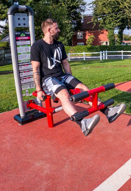 Le Leg extension est un appareil de musculation extérieur. Il est équipé d’un piston pour régler le niveau de difficulté. Idéal pour un parc sportif en plein air.